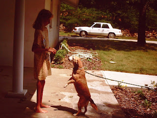 When we moved into our house about 30 years ago, the previous owner, Mr. Finch, had a dog but couldn't take him immediately with him. My parents agreed that the dog could stay and be picked up when he was able to. Well if you know me at all, you know I can fall in love with a dog in less than 30 seconds. Bosco and I were best buds immediately. About 2 months later, Mr. Finch told my dad's uncle across the street that he was going to take Bosco home with him. My uncle told him 'if you do, you're going to break one little girl's heart.' I know it was a God thing that moved his heart to think of me before himself. Mr.Finch lived alone and was a former POW veteran. I'm sure it was quite a sacrifice to give up his long loved companion to me. What a generous gift I received. Bosco lived many years after that and was loved like family. He was the first dog to get to come into the house. He met me every day as I got off the bus and I looked for him as much as he did for me.